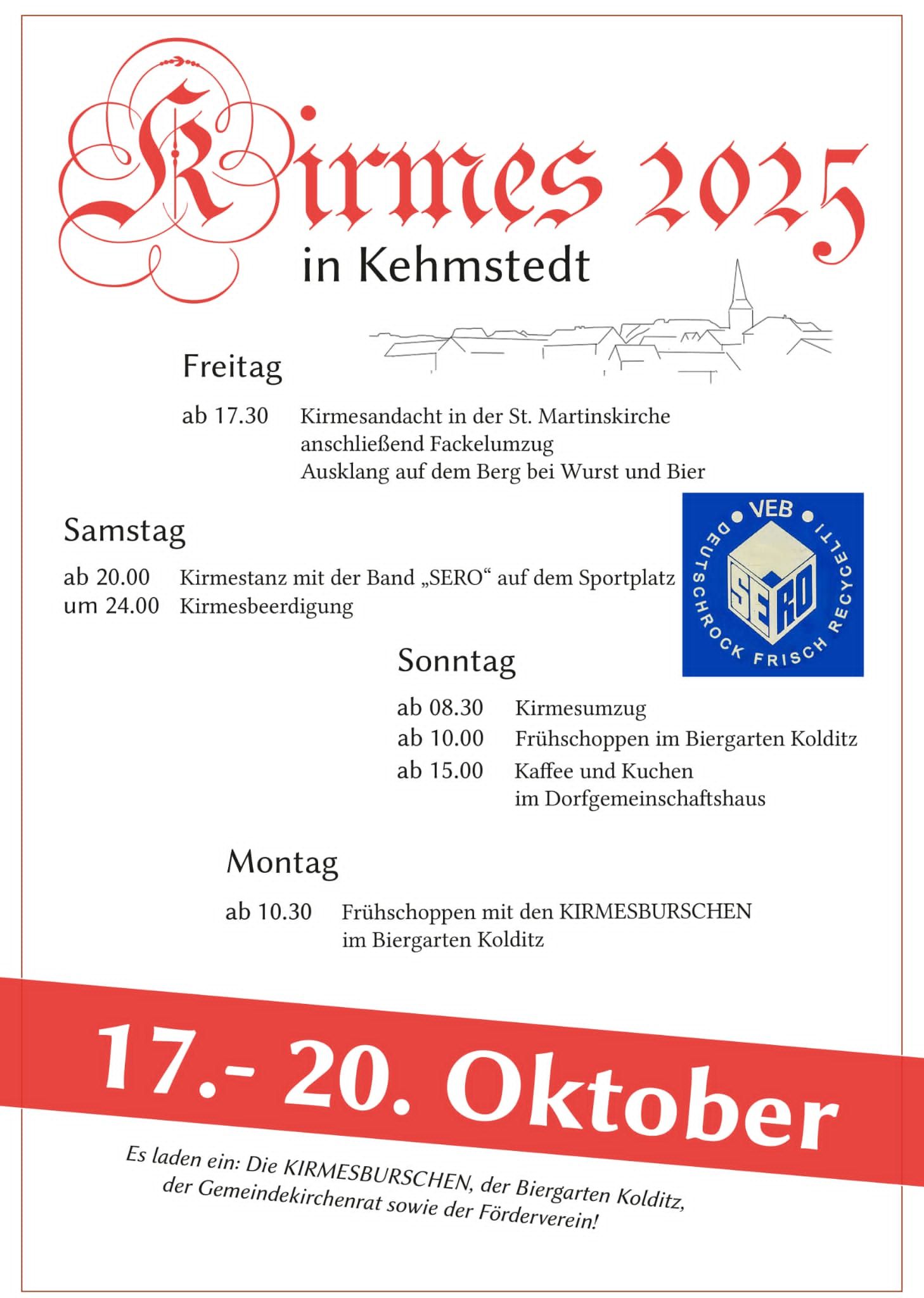 Dazu laden die Kehmstedter Kirmesburschen, die Freiwillige Feuerwehr Kehmstedt und die Bürgermeisterin sehr herzlich ein.