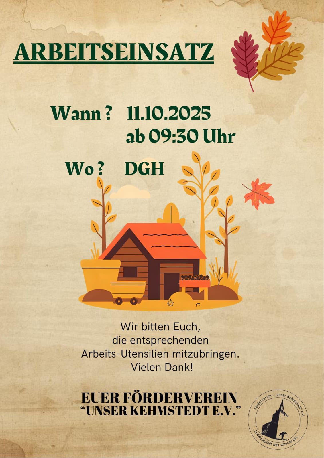 Am Samstag, den 12.11.2022, finden von 9:00 Uhr bis 11:00 Uhr Arbeitseinsätze auf dem Friedhof in Kehmstedt statt.