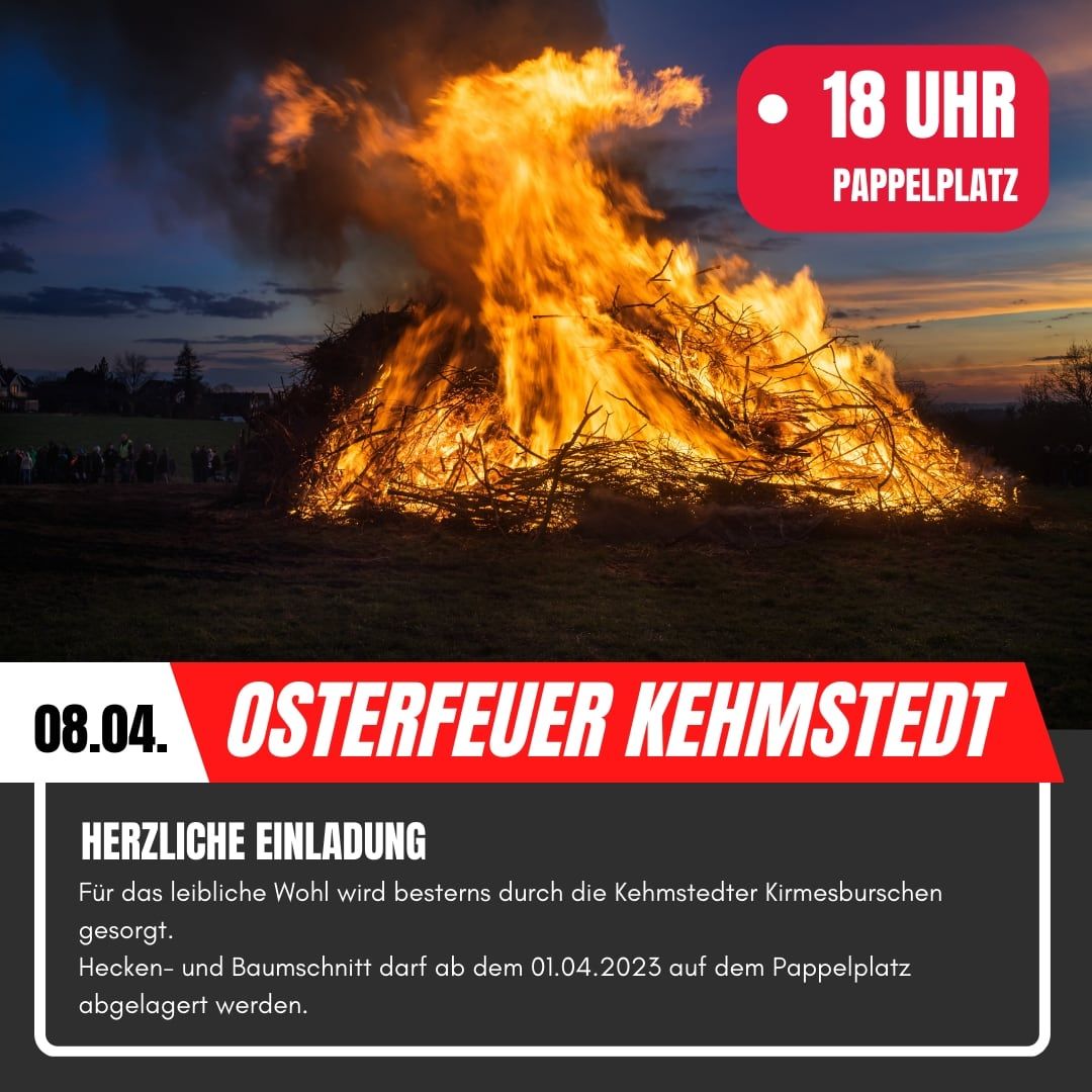 Nach zwei Jahren coronabedingter Pause findet in diesem Jahr am Karsamstag, den 16. April, um 18:00 Uhr wieder unser traditionelles Osterfeuer an der Pappelbrücke in Kehmstedt statt.
